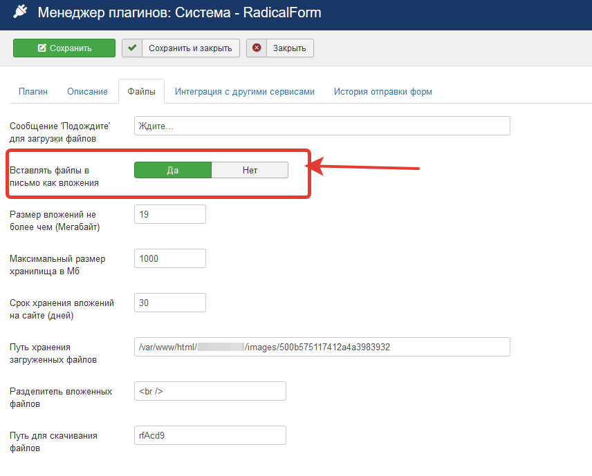 Для новых инсталляций плагина эта функция отключена по умолчанию, так как прикладывать ссылки на файлы – это самый быстрый способ отправки форм на сайте и не ограниченный по объему передаваемых файлов.